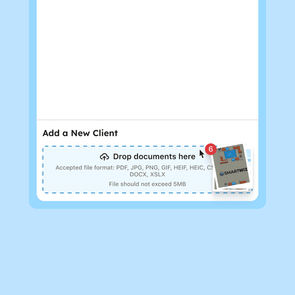 The upload area was designed to accept drag-and-drop in addition to file selection — because most preparers already have documents sitting open on their desktop. Reducing that action to a drag removed a small but real moment of friction.