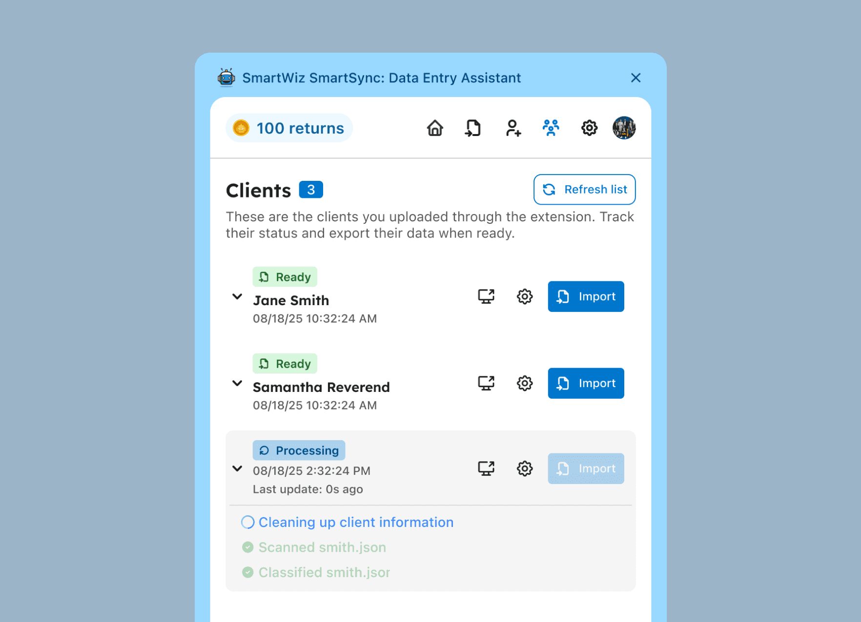 Each client row was kept dense but readable: name, status badge, and tags visible for easy scanning. When expanded, tax pros can see the progress of the data extraction for full visibility.